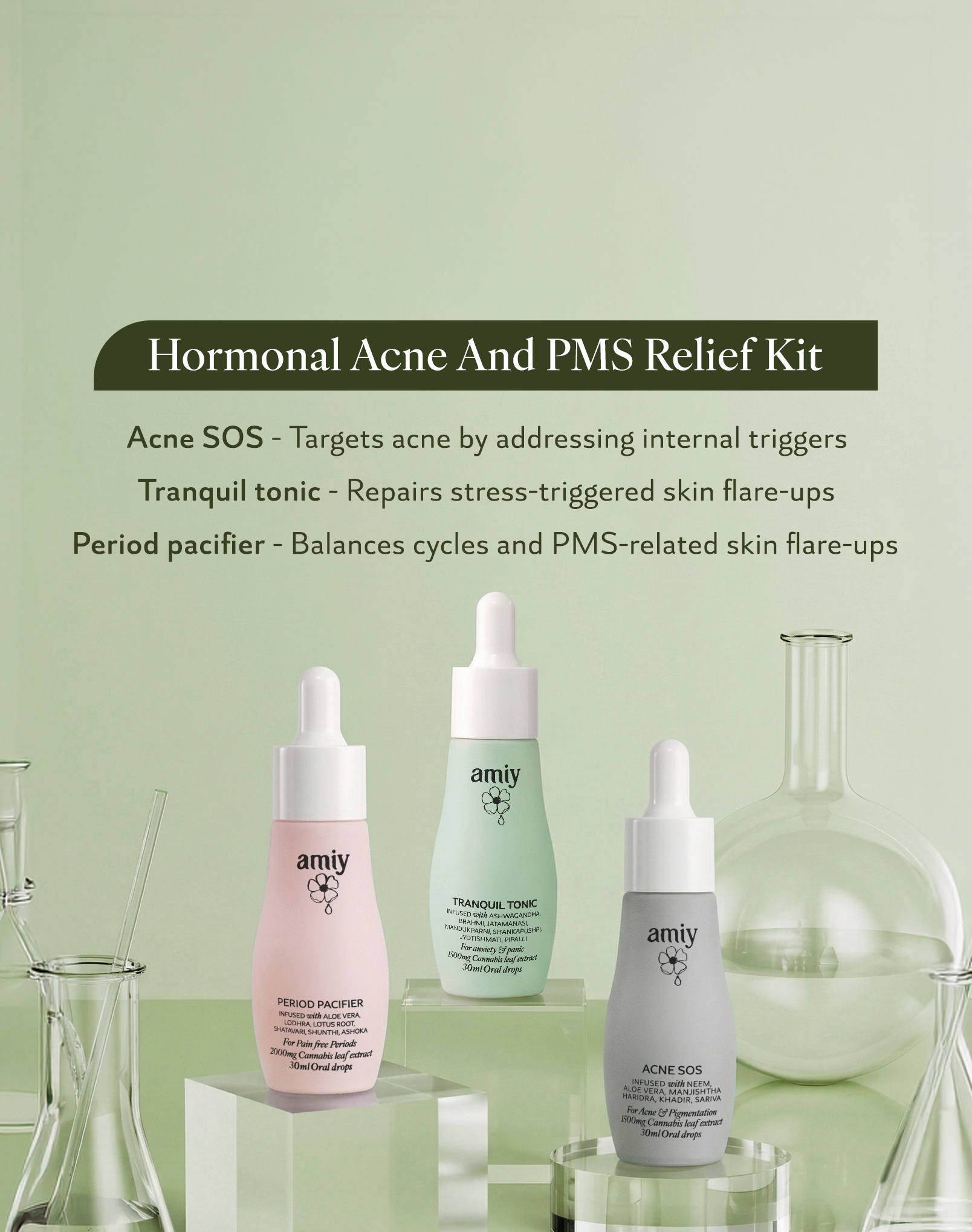 Acne SOS detoxifies and reduces inflammation, Period Pacifier repairs hormonal balance and eases PMS-related skin disruptions, while Tranquil Tonic regulates the stress response and supports skin–nerve function.