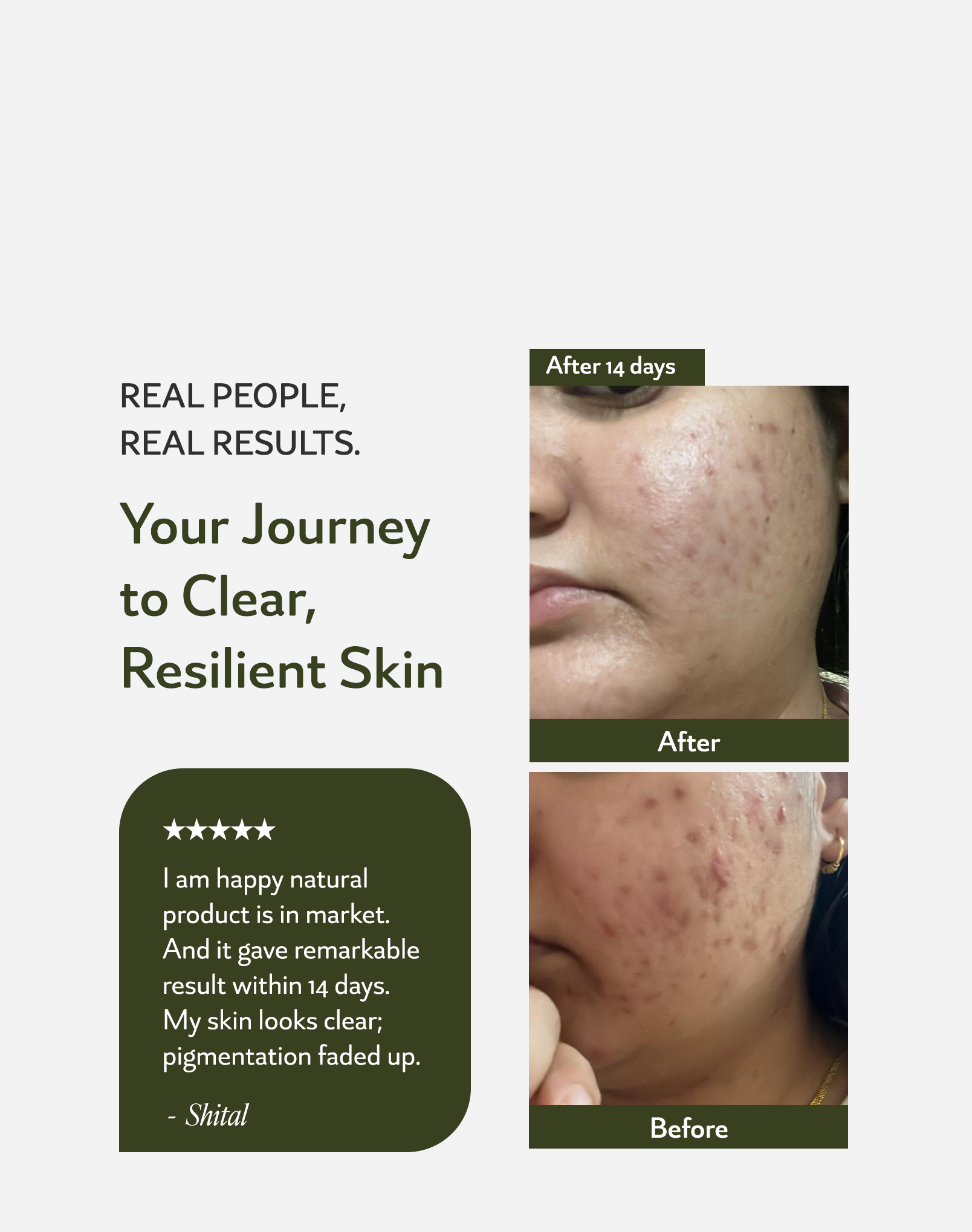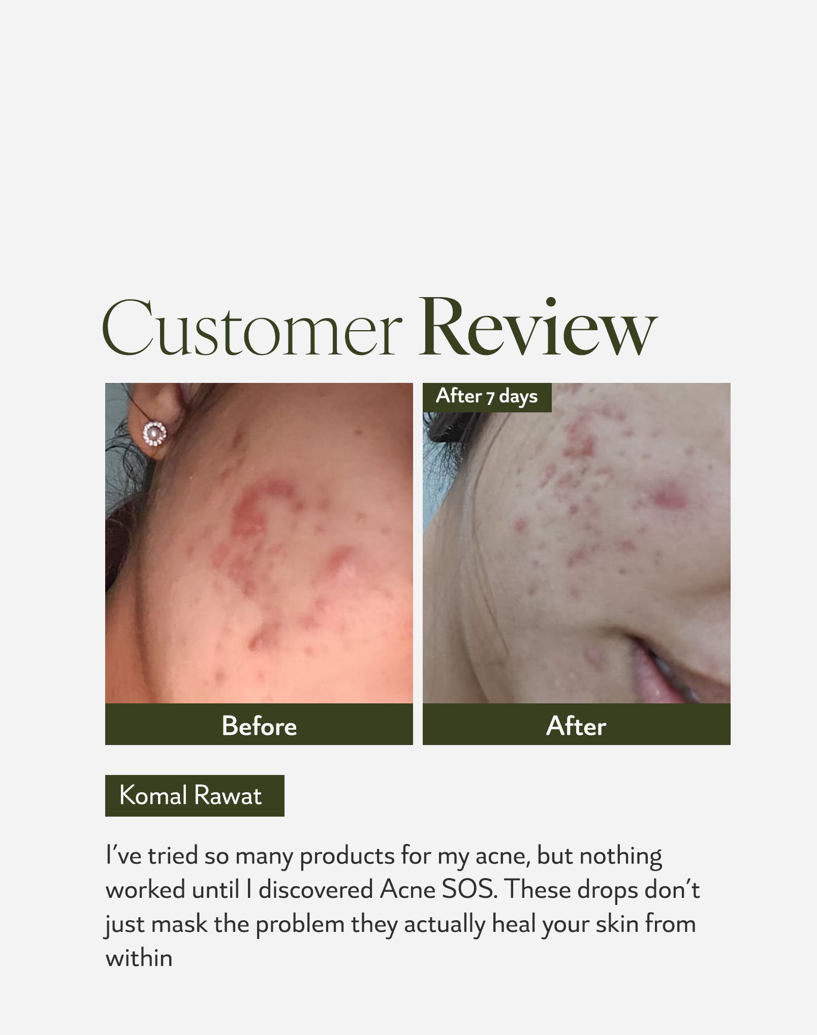 Consult nowIt has only been 14 days since I started taking Acne SOS, so I understand it may be too early to see significant results. However, I do feel that my skin is calmer now. I did get 2–3 breakouts due to my periods, but they were not as painful as they used to be earlier.