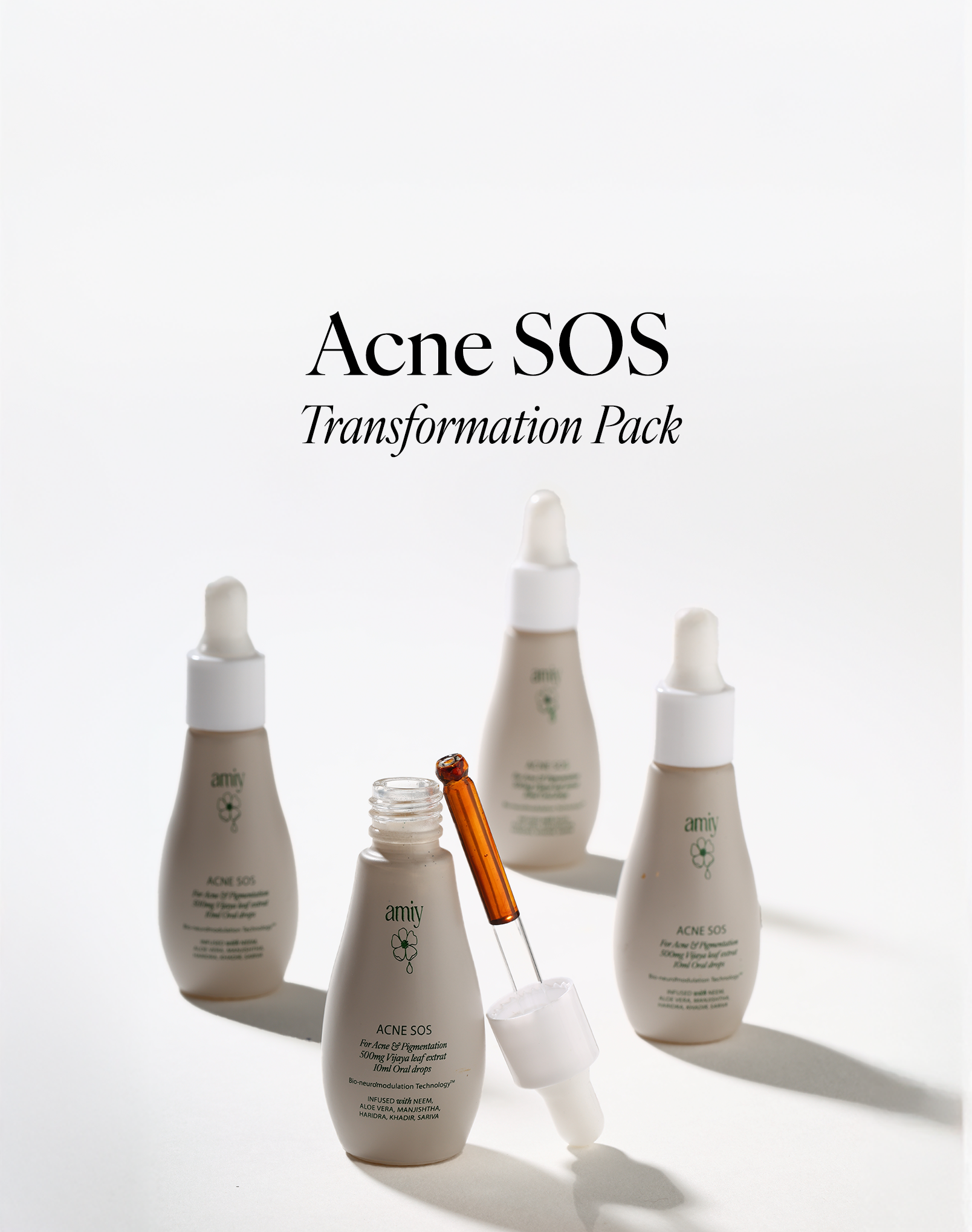 Watch your skin transform with Acne SOS dual-action advanced oral drops as every drop of our revolutionary bio-neuromodulator herbal plant elixir submerges the skin’s deepest layers with nutrition to unleash your inner brilliance. This life-giving nutrition results in brilliant and glowing skin from within. A formulation that works at reducing blemishes while erasing pigmentation and skin darkening, and lifts years of dullness to reveal a deep radiance that makes skin look lit from within. Your skin is drenched in nutrition to coax it back to its optimal state, leaving it looking dewy & luminous.