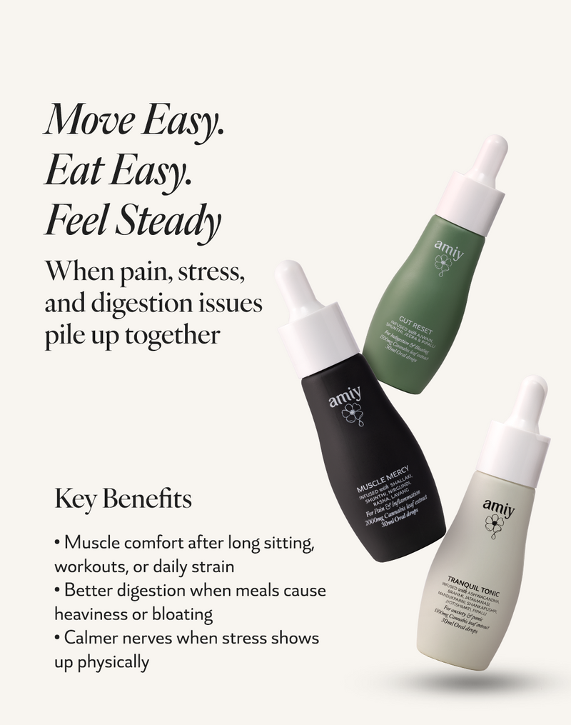 Gut Reset improves digestive balance and reduces internal buildup, Muscle Mercy repairs inflammation and joint discomfort, while Tranquil Tonic regulates stress signals that trigger pain and flare-ups.