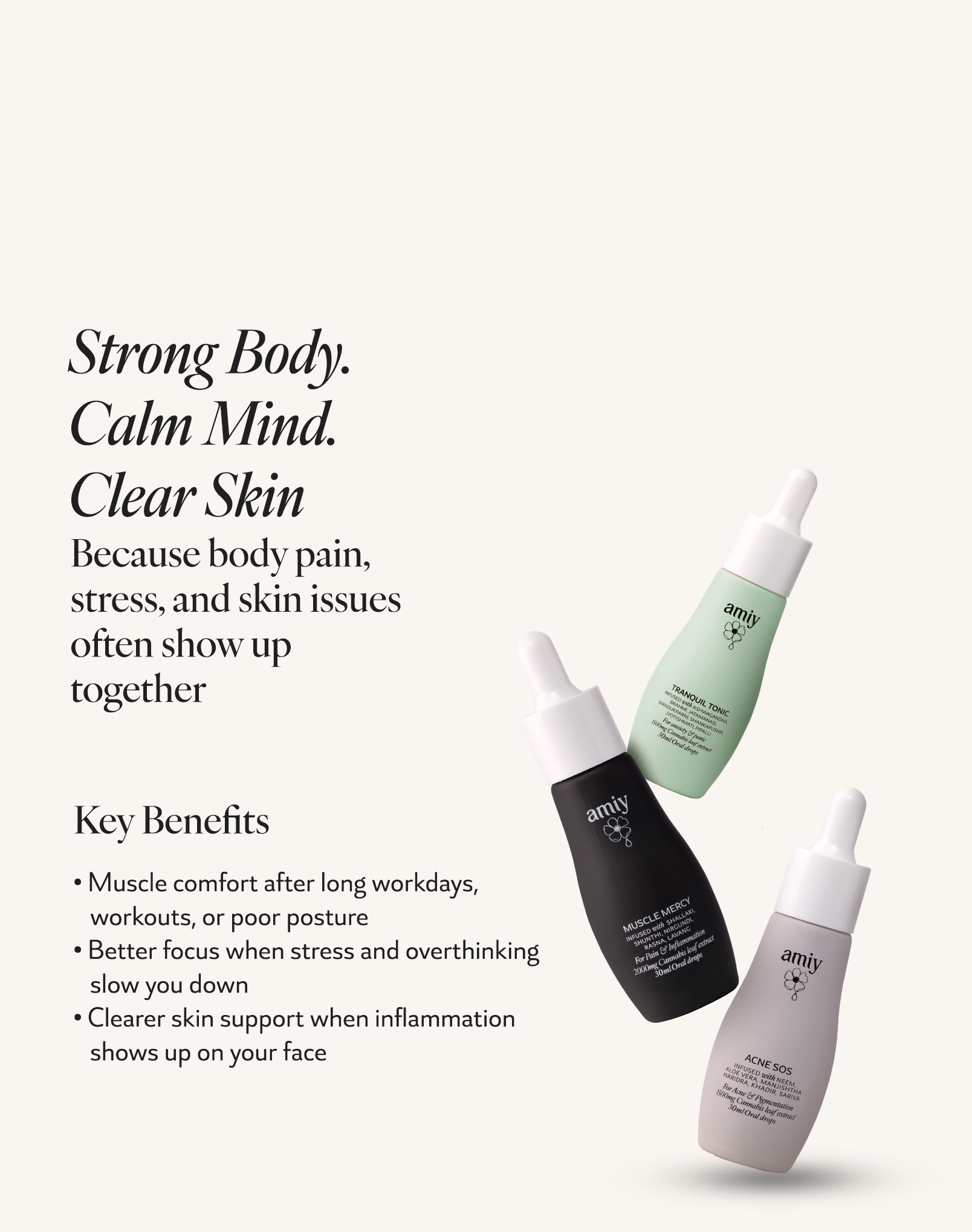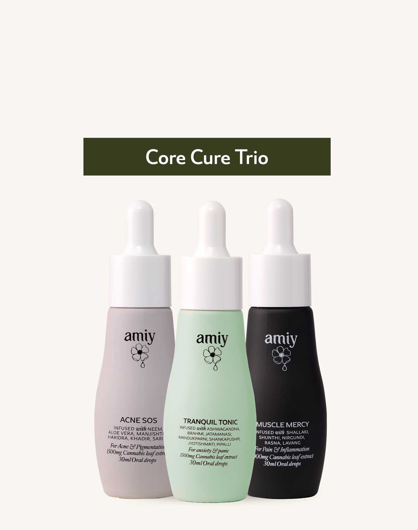 At the heart of every amiy product are the purest plant extracts, which are infused with bio-neuromodulatory technology. This technology retains a high concentration of benefits from Vijaya leaf extract and complex herbal plant elixir, nourishing skin on a cellular level to effect lasting change. These pure and powerful ingredients sourced from the foothills of the Himalayas flood your cells with nutrition to coax skin to find back its own equilibrium and restore its inborn dewy brilliance