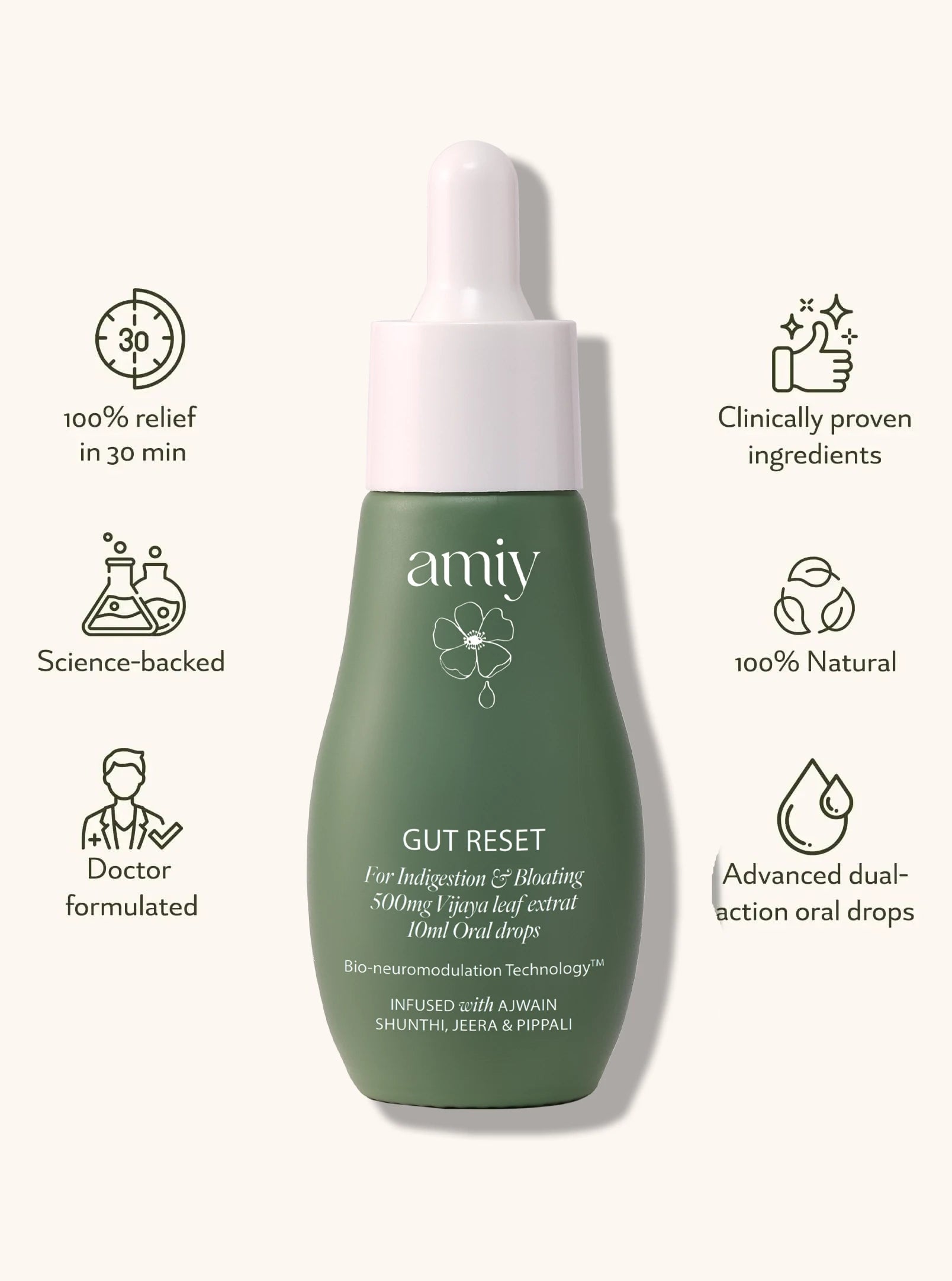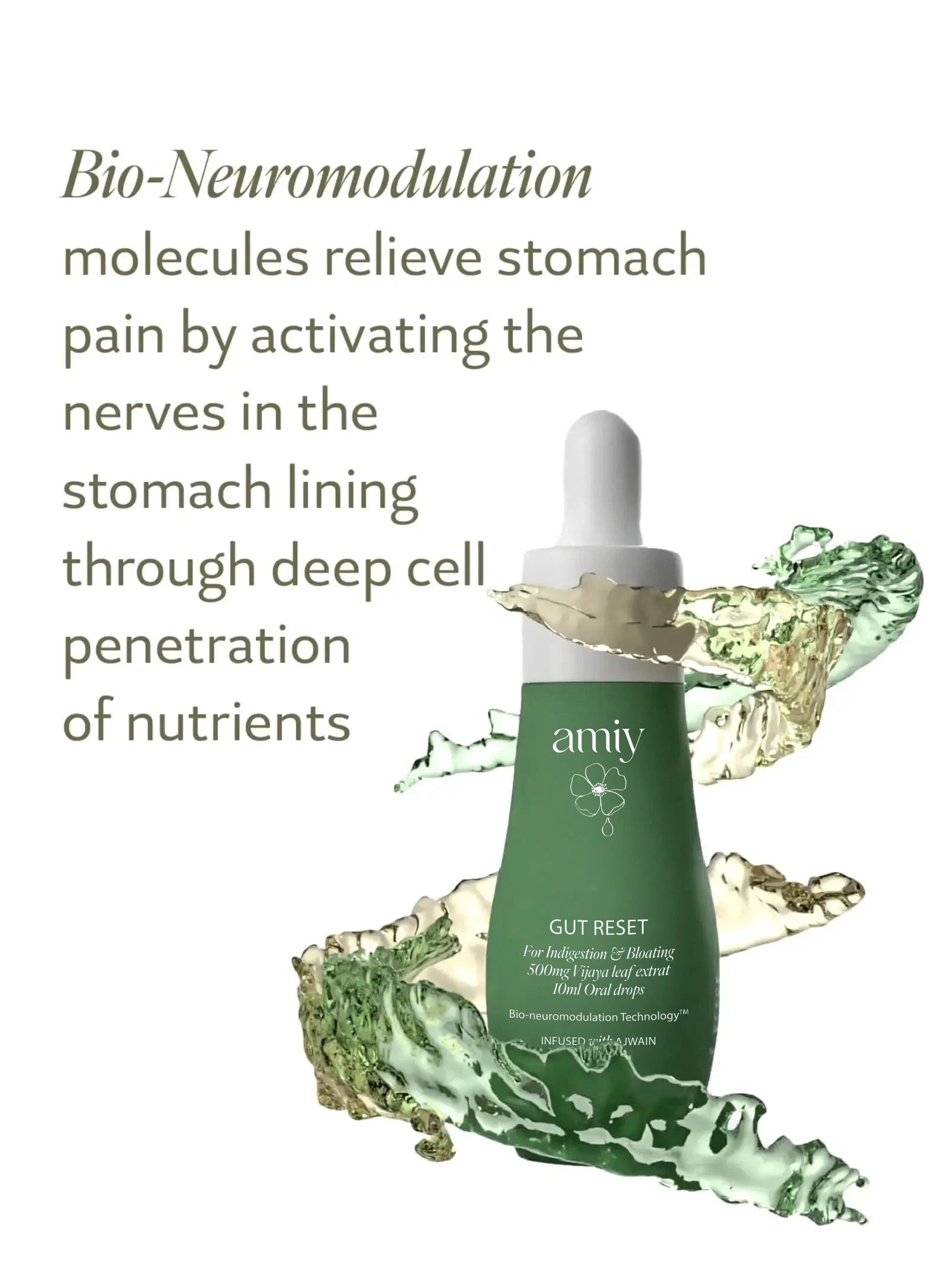 Gut Reset advanced oral drops provide fast relief from stomach pain, bloating, and indigestion using bio-neuromodulatory molecules. These molecules activate cellular functions in the gut and aid in nutrient absorption to not only relieve stomach discomfort but also restore gut health. The formula flushes out toxins while nourishing the gut to bring it back to its optimal state, promoting overall digestive wellness.
