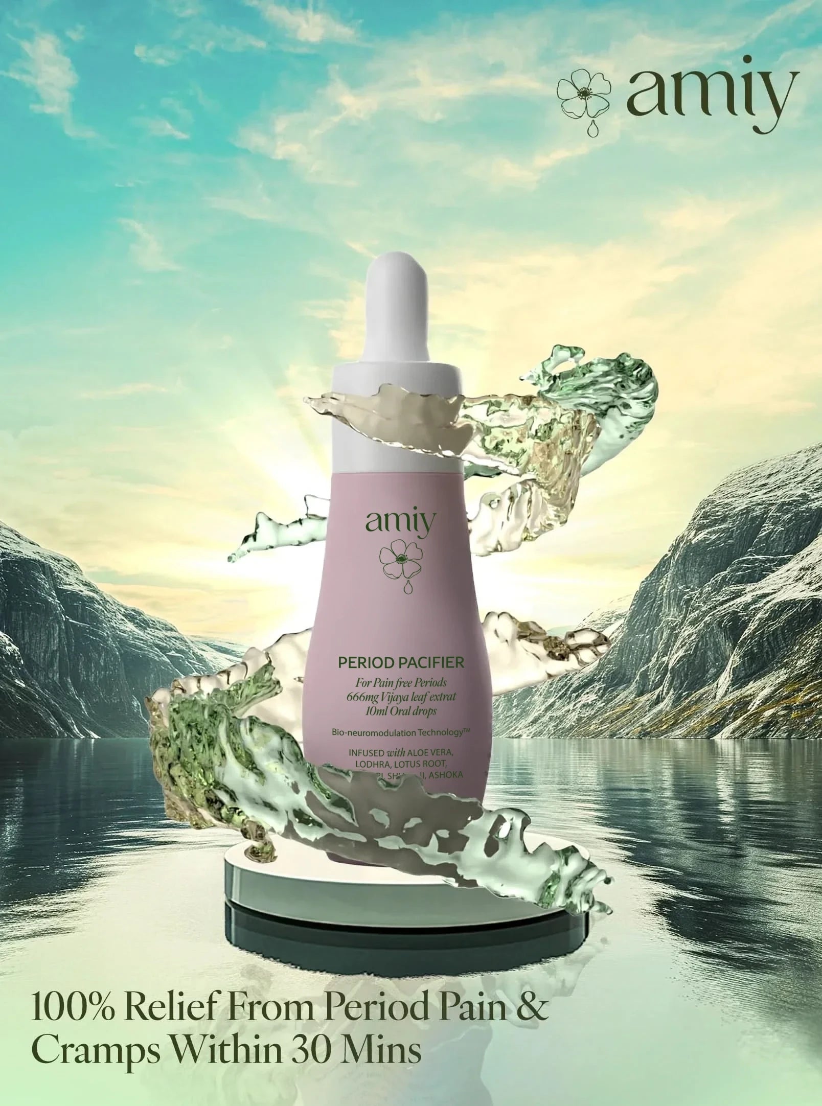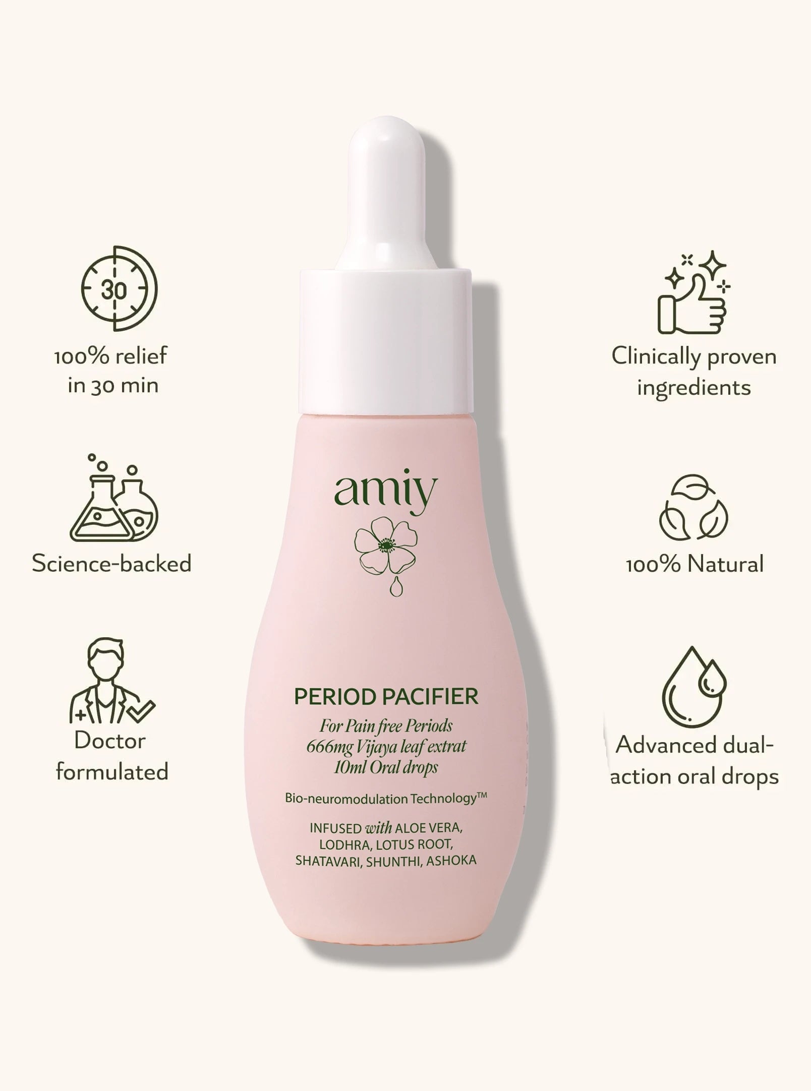 Period pain relief is a step away with Period Pacifier dual-action advanced oral drops. Witness bio-neuromodulator technology increases the benefit of active ingredients that penetrate deep within the uterus and relieve it from pain and cramps. This life-giving pain relief results in nourished, brilliant uterus health.