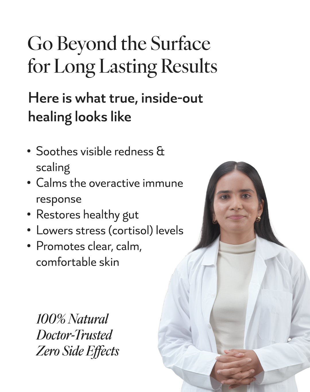 Psoriasis is not only about your skin. It’s about your gut-skin-stress connection. Our 3-combo formula supports healing at every level: