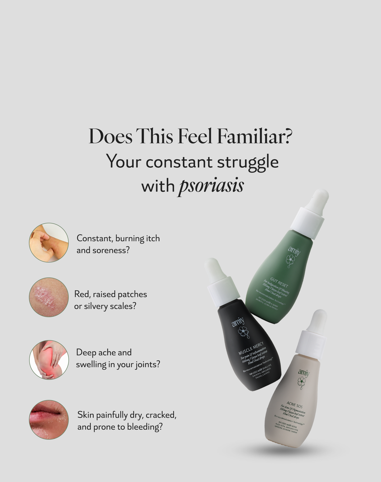 Psoriasis is not only about your skin. It’s about your gut-skin-stress connection. Our 3-combo formula supports healing at every level: