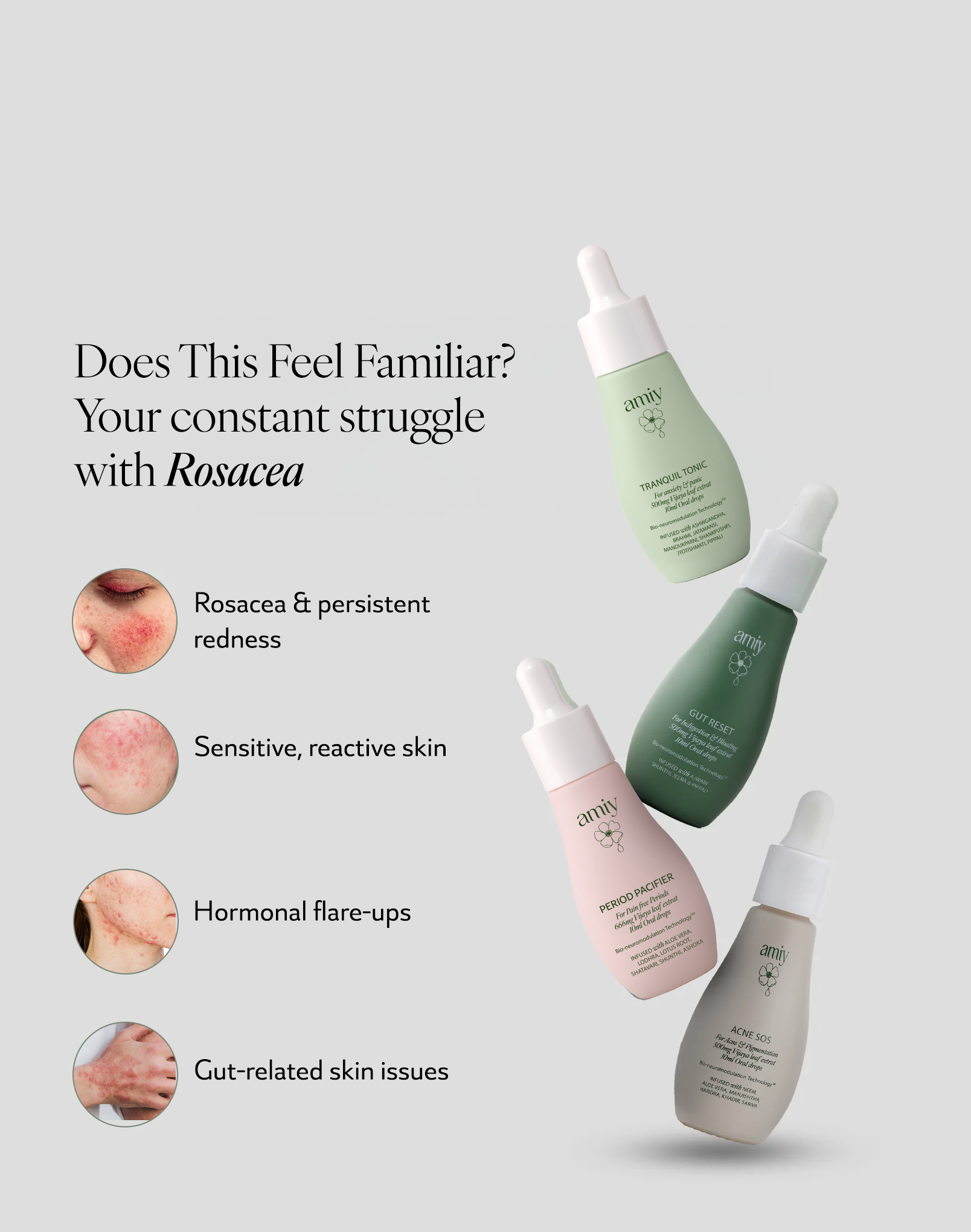 Tranquil Tonic Regulates the stress response and calms nerve-related skin sensitivity, reducing flushing and reactivity.